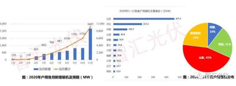 2020年1~11月,全國戶用累計裝機10.1226GW,比6GW指標高出4.12GW。1~11月累計裝機中,山東、河北、河南三省新增均超過1GW,占比均超過10%;山東新增為4.6GW,占比達到45% ,三省累計77% 。