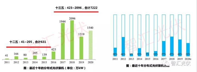 “十三五”期間,分布式光伏相對于前五年有10倍的增長;在總裝機中的占比由14%提高到32%;分布式發(fā)展受政策影響大。