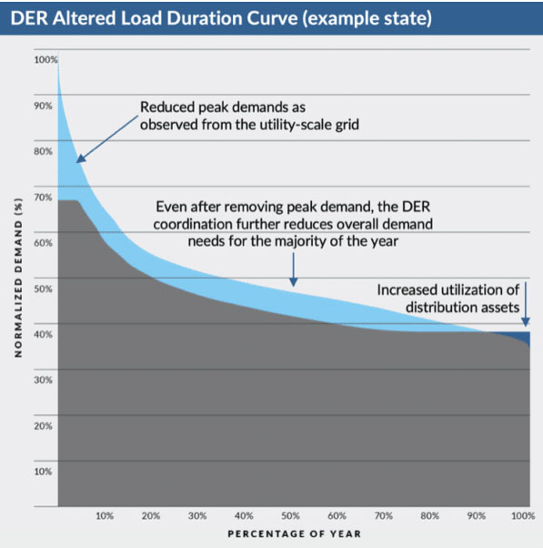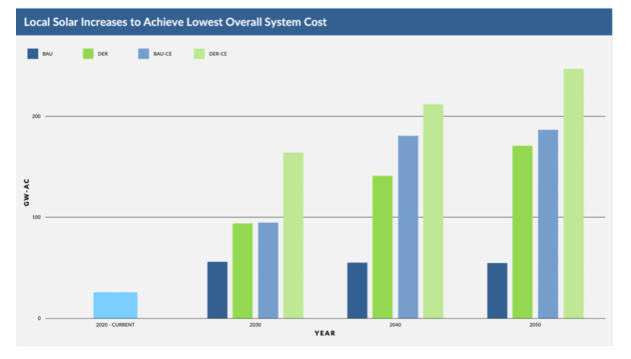 該模型發(fā)現(xiàn),通過在配電水平和更接近客戶負(fù)荷的水平上增加本地太陽能和儲能系統(tǒng)的部署,不必像許多傳統(tǒng)規(guī)劃師所設(shè)想的那樣過度依賴輸電系統(tǒng)中化石燃料發(fā)電設(shè)施,也不必低估配電系統(tǒng)的利用率。這些分布式能源(DER)有效地重塑了大型電網(wǎng)的負(fù)荷,降低了大容量電力系統(tǒng)的成本,并平滑了整個系統(tǒng)負(fù)荷的波動和變化。到2050年,通過增加247GW的分布式太陽能和160GW的分布式儲能系統(tǒng),這可以實現(xiàn)更有效的總體投資分配以及使本地電力系統(tǒng)更靈活。