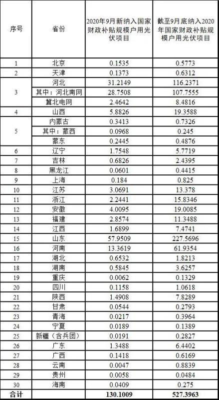 根據(jù)各省級能源主管部門、電網(wǎng)企業(yè)報送信息,經(jīng)國家可再生能源信息管理中心梳理統(tǒng)計,2020年9月新納入國家財政補(bǔ)貼規(guī)模戶用光伏項目總裝機(jī)容量為130.1萬千瓦。截至2020年9月底,全國累計納入2020年國家財政補(bǔ)貼規(guī)模戶用光伏項目裝機(jī)容量為527.4萬千瓦。詳細(xì)情況見附表。