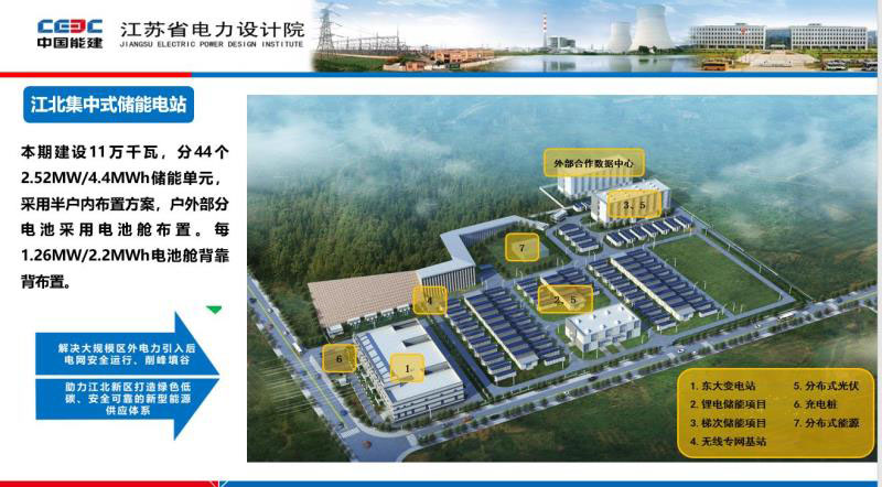 下面我著重講兩個工程實踐的案例,首先是對規(guī)?;惺絻δ?,這個案例是位于南京江北高新開發(fā)區(qū),它的立項基本目標,一個是解決大規(guī)模區(qū)外來電之后電網(wǎng)的安全運行,實現(xiàn)電網(wǎng)的削峰平。第二個,江北新區(qū)打造綠色低碳的電網(wǎng)體系。這張圖是江北儲能站的平面布置圖,不單純是電化學的儲能站,應該是多站融合的綜合性站點。其中包括在中心區(qū)域的磷酸鐵鋰集中式儲能站,還有系統(tǒng)變電站,在西北側(cè)有一個規(guī)劃的對外的數(shù)據(jù)中心,在整個站區(qū)建筑的頂面以及集裝箱的頂面布置了分布式光伏,以及一些電動汽車充電樁等等。整個站的規(guī)模也比較大,總體是分成44個單元,其中2個集裝箱背靠背組成一個單元。