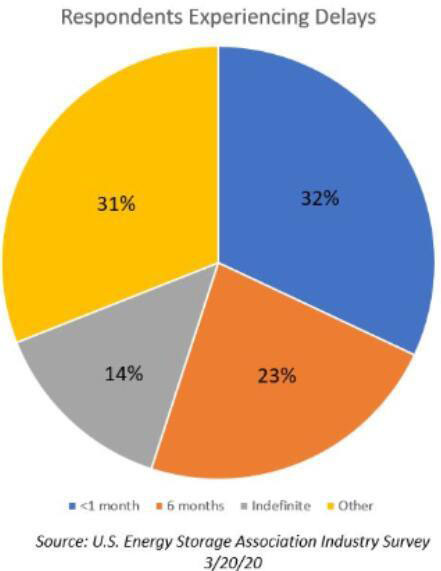 美國(guó)在三月份對(duì)儲(chǔ)能協(xié)會(huì)175名成員進(jìn)行的民意調(diào)查結(jié)果顯示,有62%的受訪者表示正遭遇儲(chǔ)能項(xiàng)目被延誤,44%的人認(rèn)為會(huì)受到一個(gè)月的短期影響,而37%預(yù)計(jì)延誤將持續(xù)六個(gè)月或更長(zhǎng)時(shí)間,還有一部分人則無(wú)法預(yù)估項(xiàng)目到底會(huì)停滯多久。