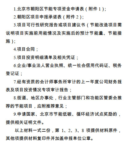 (三)申報(bào)單位根據(jù)項(xiàng)目實(shí)施情況按時(shí)申報(bào),并按照本辦法,如實(shí)填報(bào)《北京市朝陽(yáng)區(qū)節(jié)能專(zhuān)項(xiàng)資金申請(qǐng)表》(附件1)、《朝陽(yáng)區(qū)節(jié)能項(xiàng)目承諾表》(附件2),提交相關(guān)申報(bào)材料(附件3),并對(duì)材料真實(shí)性負(fù)責(zé)。項(xiàng)目單位可直接向區(qū)發(fā)展改革委申報(bào),也可由所在街鄉(xiāng)、行業(yè)主管部門(mén)、功能區(qū)管委會(huì)推薦申報(bào)。