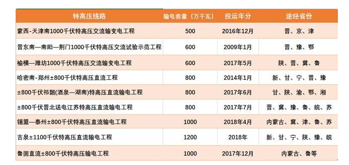 圖為三北地區(qū)部分已投運(yùn)的特高壓通道