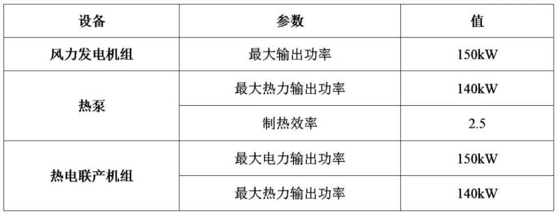 選取一種以風(fēng)電機(jī)組、熱電聯(lián)產(chǎn)機(jī)組以及柔性負(fù)荷的熱泵聯(lián)合出力的微電網(wǎng)場景進(jìn)行了調(diào)峰潛力評估。該微電網(wǎng)主要設(shè)備參數(shù)如下表所示。