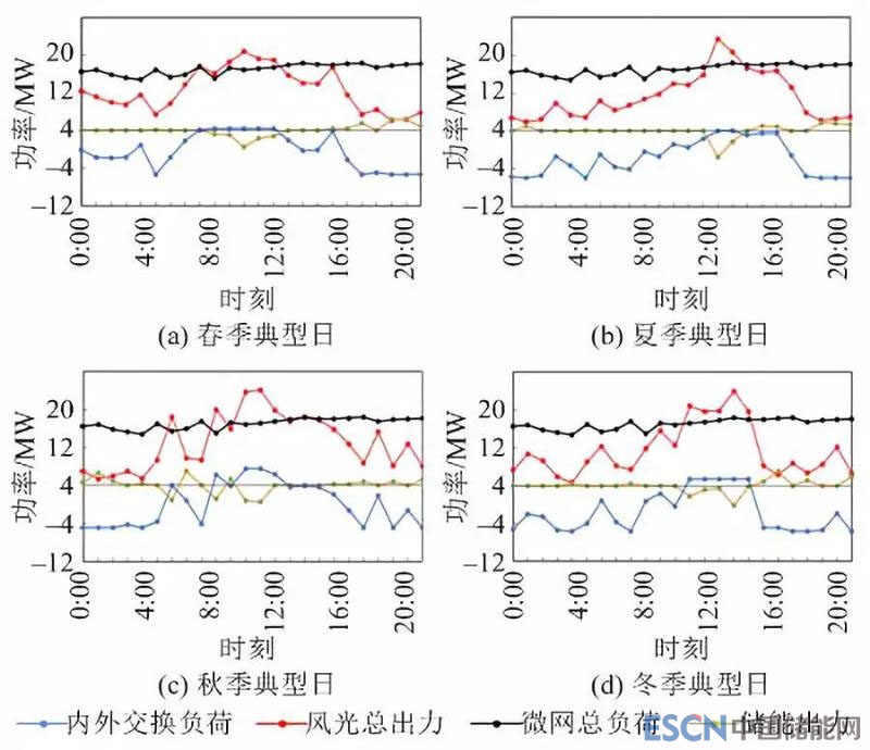 圖9和圖10為傳統(tǒng)運營模式和一體化運營模式下,春、夏、秋、冬四季典型日微網(wǎng)的運行情況(儲能出力負值表示充電,內(nèi)外交換負荷負值表示外。