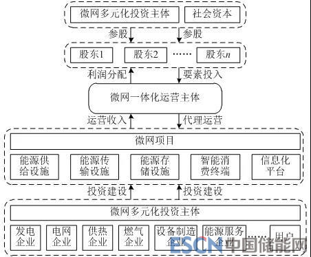 目前我國已投資建設(shè)大量微網(wǎng)項目,其中大部分微網(wǎng)“源-網(wǎng)-荷-儲”各環(huán)節(jié)能源設(shè)施由單一主體投資建設(shè)運營。但是分布式能源、傳輸網(wǎng)絡(luò)、儲能等能源設(shè)施投資規(guī)模大,缺乏合理投資回報模式,微網(wǎng)項目主體將承擔(dān)較大投資風(fēng)險。因此,本文提出微網(wǎng)運營一體化和投資多元化的模式框架。
