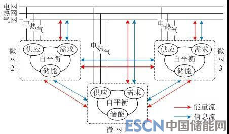 能源系統(tǒng)演化發(fā)展的基本單元是多能“供-需-儲”自平衡體,對應(yīng)園區(qū)微網(wǎng)[12],如圖2所示。微網(wǎng)通過股權(quán)并購打破能源各自運營管控壁壘,利用互聯(lián)網(wǎng)和信息技術(shù)拉近能源生產(chǎn)和消費距離,形成園區(qū)內(nèi)多能“供-需-儲”自平衡體。廣域范圍內(nèi)自平衡體在信息和經(jīng)濟激勵引導(dǎo)下,自主決策擴展,與其他能源主體或自平衡體實現(xiàn)物理網(wǎng)絡(luò)互聯(lián),形成新互聯(lián)網(wǎng)絡(luò)、新自平衡體的過程,是能源系統(tǒng)演化發(fā)展的過程。能源系統(tǒng)演化發(fā)展是基于物理-信息-經(jīng)濟耦合的多個自平衡體交互,自適應(yīng)分散決策的結(jié)果。單個自平衡體與整個能源系統(tǒng)是個體與環(huán)境的關(guān)系,個體適應(yīng)環(huán)境也造就環(huán)境。園區(qū)微網(wǎng)是能源系統(tǒng)演化發(fā)展的起點和落腳點。