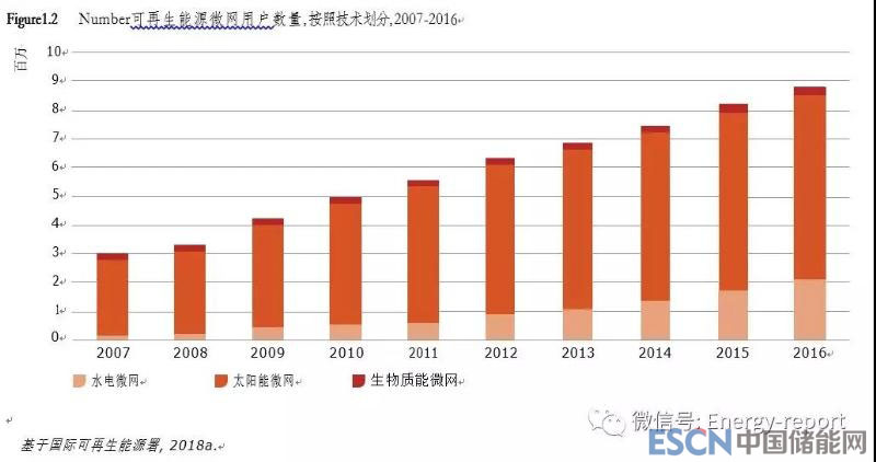 在過去十年中,可再生能源微網的數(shù)量穩(wěn)步增長? 小型水電微網是最廣泛應用的,將大多數(shù)終端用戶連接到微網中(圖1.2)?由于成本的快速降低和技術的大幅改進,太陽能光伏(PV)最近得到了迅猛增長,從2008年的11兆瓦容量增加到2017年的308兆瓦?