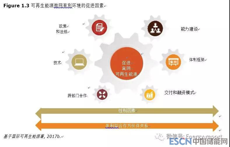 如圖1.3所示,為可再生能源微網建立有利環(huán)境取決于幾個因素? 其中包括政策和法規(guī)?體制框架?交付模式和融資,技術解決方案,能力建設和跨部門合作(國際可再生能源署,2017a)? 其中一些因素相互關聯(lián)?