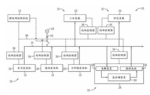 另外,微電網(wǎng)系統(tǒng)10內(nèi)的一個或多個存儲設(shè)備26可經(jīng)由傳輸線14從發(fā)電源13抽取功率。存儲設(shè)備26可用于存儲由發(fā)電源13(例如,水力發(fā)電機16、柴油發(fā)電機18或太陽能發(fā)電機20)生成的功率,并且這種存儲功率可在需要功率但并不容易獲得時(例如在斷電期間,在存在超額需求時,等等)使用。在圖示的實施例中,存儲設(shè)備26包含電解裝置28、氫存儲裝置30和一個或多個燃料電池32(例如,燃料模塊、燃料堆等)。電解裝置28可使用生成的功率(例如,電力)來生成氫并且創(chuàng)建副產(chǎn)品,例如熱和氧。生成的氫可被壓縮并且存儲在氫存儲裝置30內(nèi),并且可被燃料電池32用于在任何時間生成電力。燃料電池32可用于在期望時經(jīng)由傳輸線14向微電網(wǎng)10供應(yīng)功率。在其他實施例中,存儲設(shè)備26可以是作為一個或多個能量存儲系統(tǒng)的部分而存在的一個或多個電池或其他能量存儲設(shè)備/資產(chǎn)。