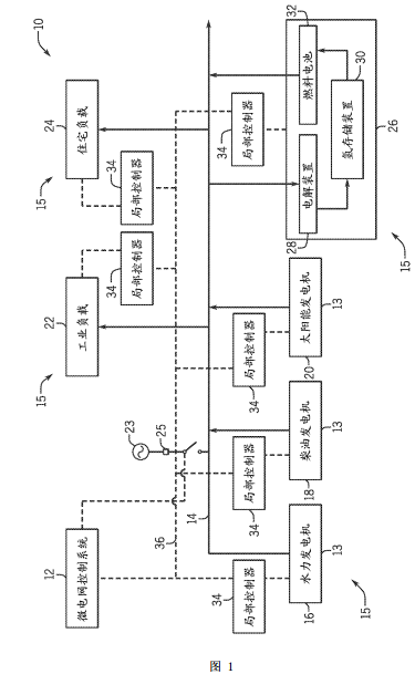 在圖示的實施例中,微電網(wǎng)10可包含各種功率發(fā)電機源13,比如例如水力發(fā)電機16、柴油發(fā)電機18和太陽能發(fā)電機20。在其他實施例中,微電網(wǎng)10可包含其他形式的可分派、不可分派或可再生發(fā)電源,比如例如組合熱和功率發(fā)電機或風(fēng)力渦輪機。由這些發(fā)電源產(chǎn)生的功率可經(jīng)由傳輸線14輸送給微電網(wǎng)10內(nèi)的負載。例如,在圖示的實施例中,由水力發(fā)電機16、柴油發(fā)電機18和/或太陽能發(fā)電機20產(chǎn)生的功率可經(jīng)由傳輸線14輸送給工業(yè)負載22或住宅負載24。在其他實施例中,產(chǎn)生的功率可經(jīng)由傳輸線14輸送給其他負載,例如市政當(dāng)局(例如,一個或多個房子、住宅區(qū)域、建筑、城市等)、車輛充電系統(tǒng)和/或商業(yè)設(shè)施(例如,一個或多個商店、制造廠、商業(yè)區(qū)等)。在某些實施例中,微電網(wǎng)10可在共同耦合25(例如,PCC 25)的點處通過斷路器耦合于主電網(wǎng)23(例如,公用事業(yè))。