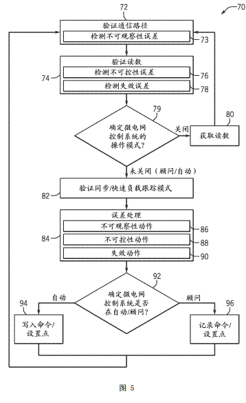 在驗證通信路徑36時,控制系統(tǒng)12可與微電網(wǎng)資產(chǎn)15通信,并且具體地,可從微電網(wǎng)資產(chǎn)15讀取信息。從微電網(wǎng)資產(chǎn)15讀取的信息可包含資產(chǎn)15的性能歷史或歷史統(tǒng)計、由資產(chǎn)15生成的功率量、由資產(chǎn)15傳送、存儲或接收的能量的量、資產(chǎn)15的操作模式或狀態(tài)等等。因此,方法70則包含驗證從微電網(wǎng)資產(chǎn)15收集的讀數(shù)(框74)。在該驗證過程期間,控制系統(tǒng)12可配置成監(jiān)測和檢測各種類型的不可控性和失效誤差。在一些實施例中,存在可被控制系統(tǒng)12檢測的五個類型的不可控性誤差(框76)。不可控性類型I指在線設(shè)備從控制系統(tǒng)12接收關(guān)閉命令但它未關(guān)閉時的情況。不可控性類型II指離線設(shè)備從控制系統(tǒng)12接收打開命令但它未接通時的情況。不可控性類型III指在改變設(shè)備或資產(chǎn)的操作模式方面的不成功嘗試。例如,柴油發(fā)電機18使每10秒從控制系統(tǒng)12接收命令保持在同步操作模式,但這并未發(fā)生。不可控性類型IV對應(yīng)于參考功率命令和來自微電網(wǎng)10的對應(yīng)實際讀數(shù)之間的差異超過某一水平時的情況。不可控性類型V指在控制系統(tǒng)12未處于自動操作模式時局部控制器34的非期望激活。在這類情形中,采用局部控制器34的優(yōu)化命令的傳達或?qū)懭脒^程(例如,優(yōu)化分派過程71)僅在控制系統(tǒng)12處于自動模式時發(fā)生。同樣,在控制系統(tǒng)12處于關(guān)閉或顧問模式時局部控制器34的操作未被預(yù)期。盡管描述五個類型的不可控性誤差,應(yīng)注意根據(jù)在微電網(wǎng)10內(nèi)操作的不同類型的微電網(wǎng)資產(chǎn)15可檢測或監(jiān)測任何數(shù)量的不可控性誤差。