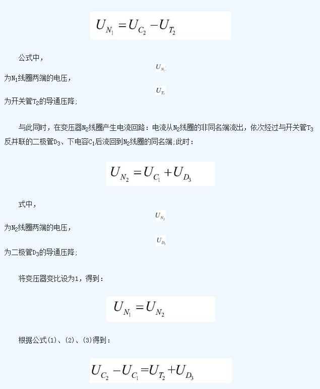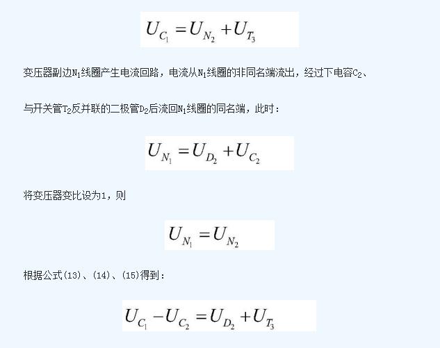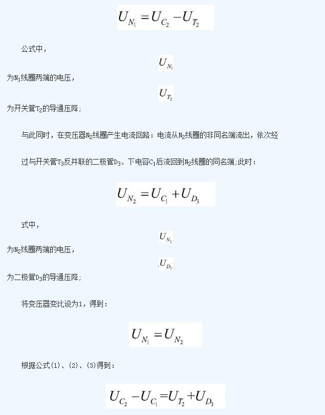 即上電容C1的電壓值與下電容C2的電壓值之差即為開關(guān)管T2的導(dǎo)通壓降與二極管D3的導(dǎo)通壓降之和;下電容C2在該工作狀態(tài)中不斷放出能量,能量被N1線圈吸收后傳遞給N2線圈,然后由N2線圈通過二極管D3不斷向電容上C1充電;這個(gè)過程中,C2放電,C1充電, 不斷減小, 不斷增加,二者電壓差減少;
