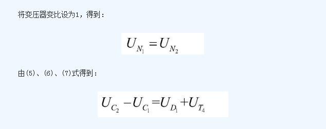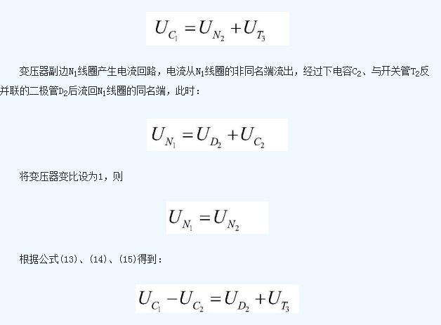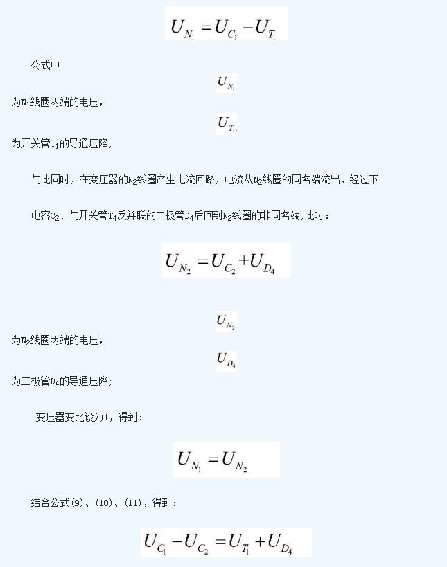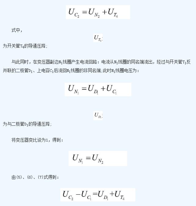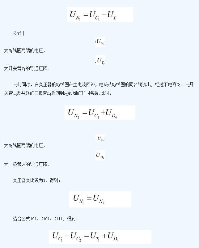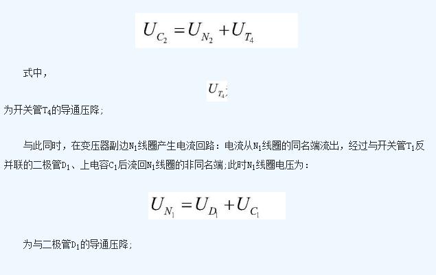 上電容C1的電壓值與下電容C2的電壓值之差為開關(guān)管T1的導(dǎo)通壓降與二極管D4的導(dǎo)通壓降之和;上電容C1在該工作狀態(tài)中不斷放出能量,能量被N1線圈吸收后傳遞給N2線圈,然后由N2線圈通過二極管D4不斷向下電容C2充電;在這個(gè)過程中,上電容C1放電,下電容C2充電, 不斷減小, 不斷增加,二者電壓差減少;