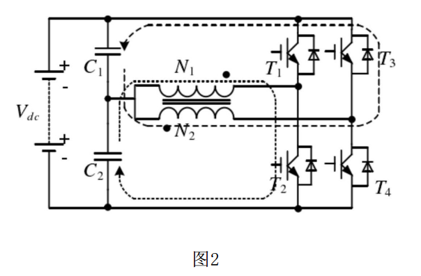 (一)當(dāng)上電容C1上的電容電壓 小于下電容C2上的電容電壓 時(shí),開關(guān)管T2和T4輪流導(dǎo)通,變壓器N1線圈和N2線圈交替作為變壓器原邊,把下電容C2的能量傳遞到上電容C1上,實(shí)現(xiàn)上下電容電壓的均衡,開關(guān)管T1和T3一直保持?jǐn)嚅_狀態(tài);