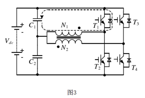 (3)所述③ 狀態(tài)在② 狀態(tài)的續(xù)流完成后開始,此狀態(tài)下,開關(guān)管T4導(dǎo)通,T1、T2、T3關(guān)斷;電流從下電容C2正端流出,經(jīng)過N2線圈、開關(guān)管T4后流回下電容C2的負(fù)端,此時(shí):
