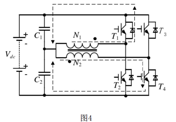(3)所述③ 狀態(tài)在② 狀態(tài)的續(xù)流完成后開始,此狀態(tài)下,開關(guān)管T4導(dǎo)通,T1、T2、T3關(guān)斷,電流流向如圖4所示。電流從下電容C2正端流出,經(jīng)過N2線圈、開關(guān)管T4后流回下電容C2的負(fù)端,此時(shí):