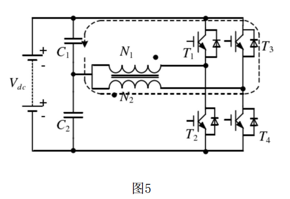 (1)⑤ 狀態(tài)時(shí),開關(guān)管T1導(dǎo)通,T2、T3、T4關(guān)斷;電流從上電容C1的正端流出,經(jīng)過開關(guān)管T1、N1線圈后流回上電容C1的負(fù)端;根據(jù)基爾霍夫方程得到: