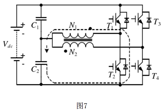 (3)⑦ 狀態(tài)在⑥ 狀態(tài)的續(xù)流完成后開始,該狀態(tài)下開關(guān)管T3導(dǎo)通,T1,T2,T4關(guān)斷;電流從上電容C1正端流出,經(jīng)過開關(guān)管T3、N2線圈后流回上電容C1的負(fù)端,此時(shí):
