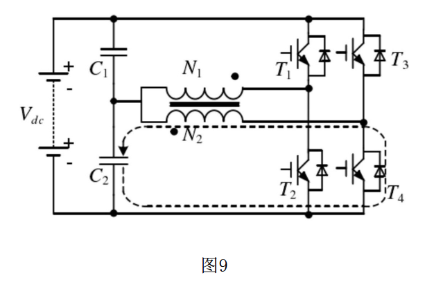 (4)⑦ 狀態(tài)后緊接著是⑧ 狀態(tài),該狀態(tài)下T1、T2、T3、T4關(guān)斷;該狀態(tài)為⑦ 狀態(tài)的續(xù)流階段,電路中的電流方向如圖9所示。電流從N2線圈的同名端流出,經(jīng)過下電容C2、二極管D4后流回到N2線圈的非同名端,該回路的電流不斷減小,直到為0。