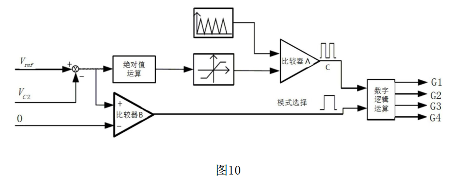 本發(fā)明的網(wǎng)絡(luò)拓?fù)浣Y(jié)構(gòu)增加了四個(gè)開關(guān)管,由電路的模態(tài)分析,通過變壓器的繞組交替作為原邊繞組,最終設(shè)計(jì)的控制電路如圖10所示。所述驅(qū)動(dòng)信號(hào)生成模塊包括減法運(yùn)算單元,絕對(duì)值運(yùn)算單元、限幅單元、三角波載波信號(hào)發(fā)生單元、多個(gè)比較器、數(shù)字邏輯運(yùn)算單元、0V電壓給定單元;