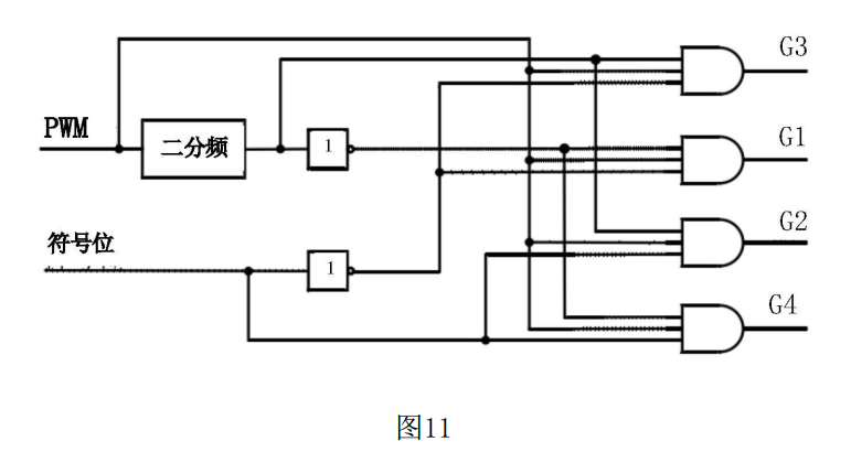 原始PWM信號(hào)先通過二分頻,二分頻的輸出及其取反信號(hào)用于控制兩個(gè)上開關(guān)管還是兩個(gè)下開關(guān)管交替導(dǎo)通,符號(hào)位及其取反信號(hào)用于控制兩個(gè)上開關(guān)管的使能還是下開關(guān)管的使能。最終通過四個(gè)三輸入與門進(jìn)行信號(hào)的耦合,來分別控制四個(gè)開關(guān)管的開通關(guān)斷。