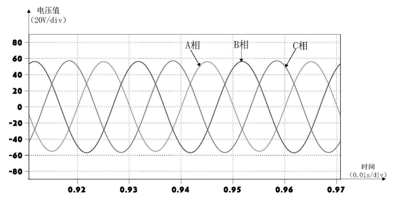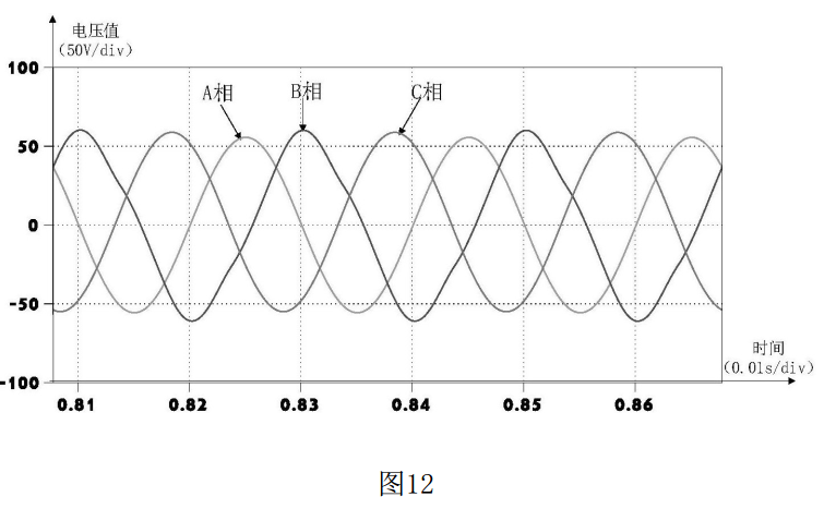 圖12為傳統(tǒng)逆變器輸出電壓波形,圖12表明,0.81s到0.87s時(shí)可以發(fā)現(xiàn)B相電壓波形發(fā)生了比較明顯的畸變和不對(duì)稱。