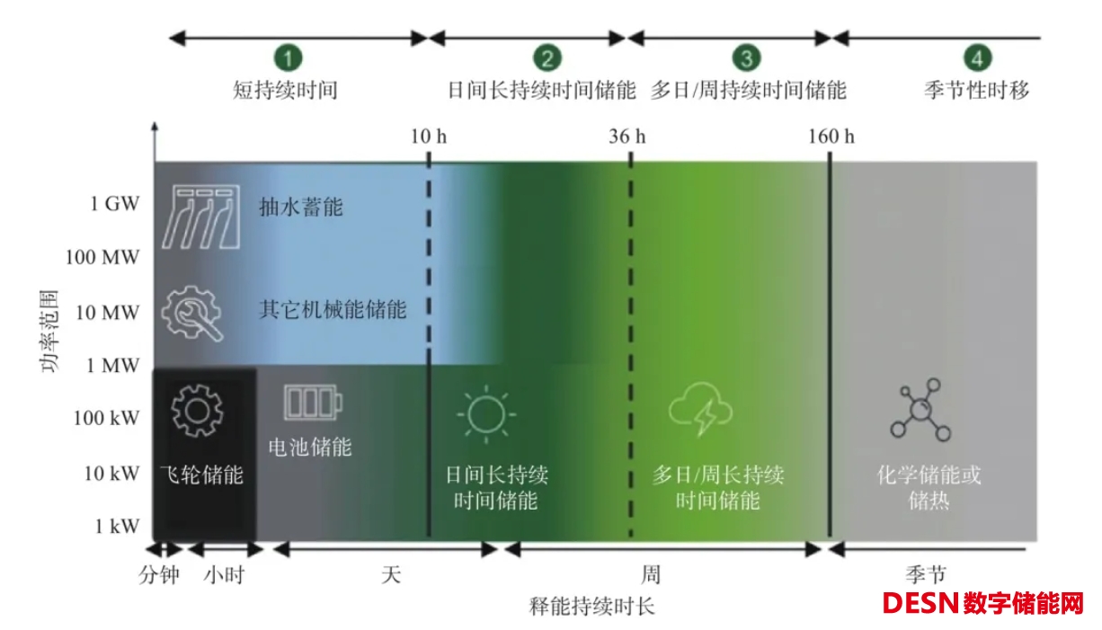 以美國能源部為例,美國能源部在其“Long Duration Storage Shot(長持續(xù)時間儲能攻關行動)”中,將長持續(xù)時間儲能(LDES)定義為一次可以儲存能量(可持續(xù)以滿功率釋放能量)超過10小時的儲能系統(tǒng)。釋能持續(xù)時長0~10小時的稱為“短持續(xù)時間儲能”(如飛輪儲能),10小時以上的統(tǒng)稱為“長持續(xù)時間儲能”,且長持續(xù)時間儲能還可以繼續(xù)細分,10~36小時的為“日間長持續(xù)時間儲能”(有時也稱為“日內長持續(xù)時間儲能”,如傳統(tǒng)抽蓄、新型抽蓄、重力儲能、壓縮空氣儲能、液態(tài)空氣儲能、液態(tài)二氧化碳儲能等機械式儲能技術),36~160小時的為“多日/周持續(xù)時間儲能”(如顯熱、潛熱、熱化學儲熱技術,液流電池、金屬陽極電池、混合液流電池等電化學儲能技術等),超過160小時的稱為“季節(jié)性時移儲能”(如儲氫、熱化學儲熱)等。有的也將“多日/周持續(xù)時間儲能”和“季節(jié)性時移儲能”統(tǒng)稱為“季節(jié)性儲能”。
