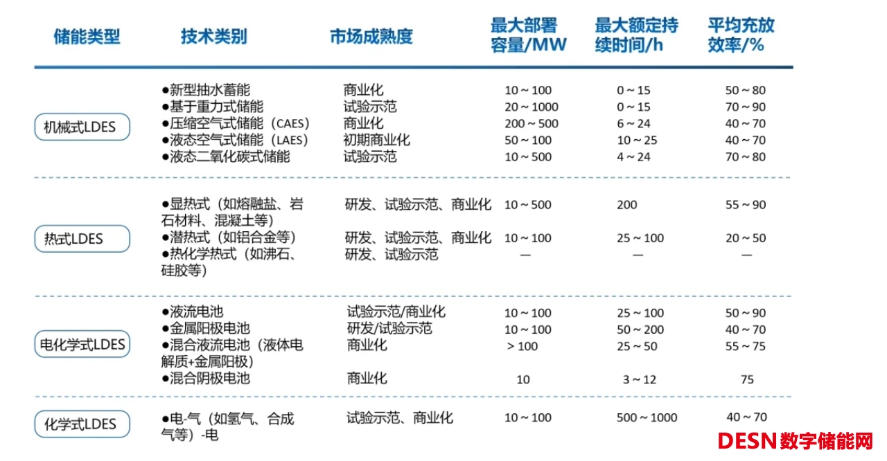↑ 各類長持續(xù)時間儲能技術主要參數及市場成熟度