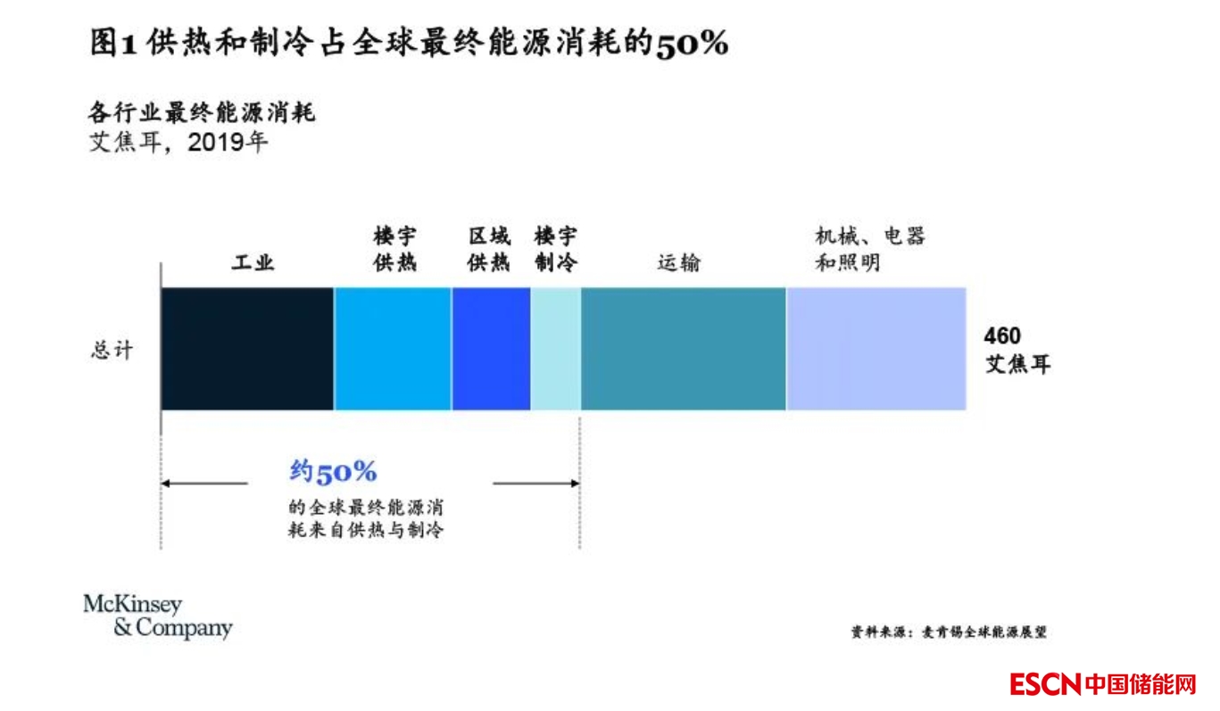 隨著全球能源系統(tǒng)脫碳的不斷推進(jìn),人們的視線也逐漸轉(zhuǎn)移到最重要也最難脫碳的介質(zhì)之一——熱能。熱能主要應(yīng)用于工業(yè)生產(chǎn)、樓宇供熱/制冷和區(qū)域供暖,在全球終端能源消耗中的占比已超過(guò)50%(見(jiàn)圖1)。由于目前大多數(shù)熱能的來(lái)源仍是化石燃料,供熱與制冷占到了全球能源相關(guān)碳排放【1】的45%,加速熱能脫碳對(duì)實(shí)現(xiàn)凈零排放至關(guān)重要。