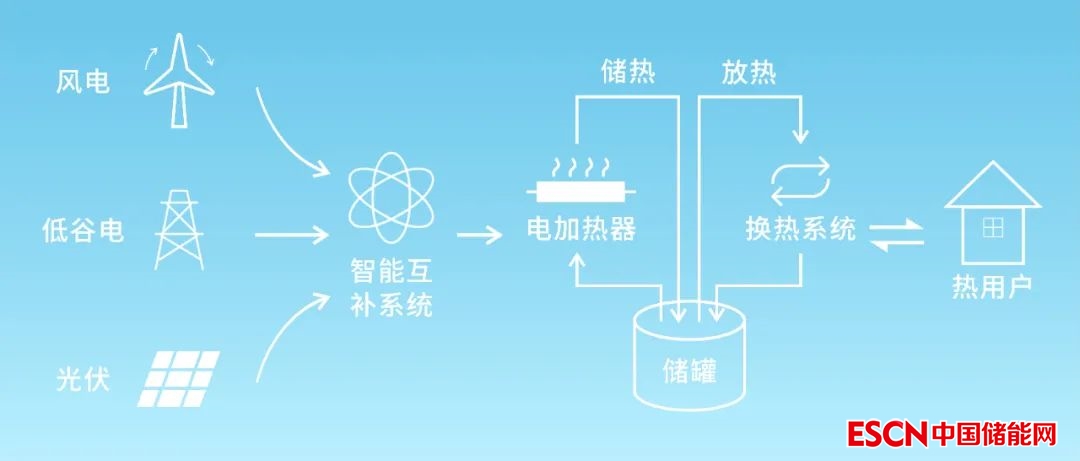 一方面,采用智能互補(bǔ)系統(tǒng)將風(fēng)電、光伏、夜間低谷電等作為能量源,通過(guò)電加熱器加熱熔鹽,儲(chǔ)存熱量;另一方面,在換熱系統(tǒng)中高溫熔鹽與水進(jìn)行換熱,釋放熱量。為了讓大家更直觀地理解,小e給大家做了一張?jiān)韴D。