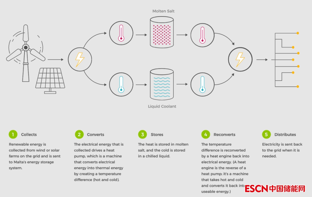 和國(guó)內(nèi)主流的熔鹽儲(chǔ)能技術(shù)不同的是,Malta在系統(tǒng)中采用了高溫?zé)岜?。如上圖所示,可再生能源的廉價(jià)電能進(jìn)入儲(chǔ)能系統(tǒng),通過(guò)一種高溫?zé)岜脤㈦娔苻D(zhuǎn)化為冷能和熱能兩種形式,熱能存儲(chǔ)于熔鹽中,冷能存儲(chǔ)于一種冷凍液中,在需要之時(shí),冷熱能可通過(guò)一種熱機(jī)再次轉(zhuǎn)為電能,返回電網(wǎng),也可將熱能和冷能直接供應(yīng)給能源用戶。