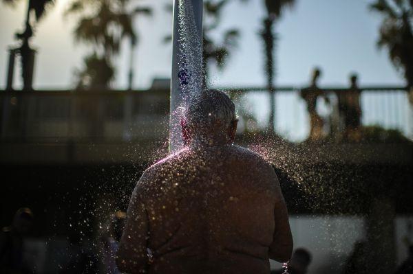 7月21日,一名男子在西班牙巴塞羅那的海灘上沖涼。