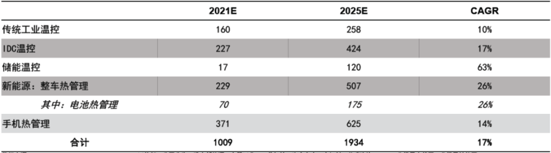 國信證券預(yù)測,綜合考慮傳統(tǒng)工業(yè)溫控、IDC機(jī)房溫控、儲能溫控、新能源車熱管理及手機(jī)溫控空間,預(yù)計2025年溫控市場有望超過1900億元,其中,儲能溫控市場規(guī)模預(yù)計可達(dá)120億元,復(fù)合年均增長率高達(dá)63%。