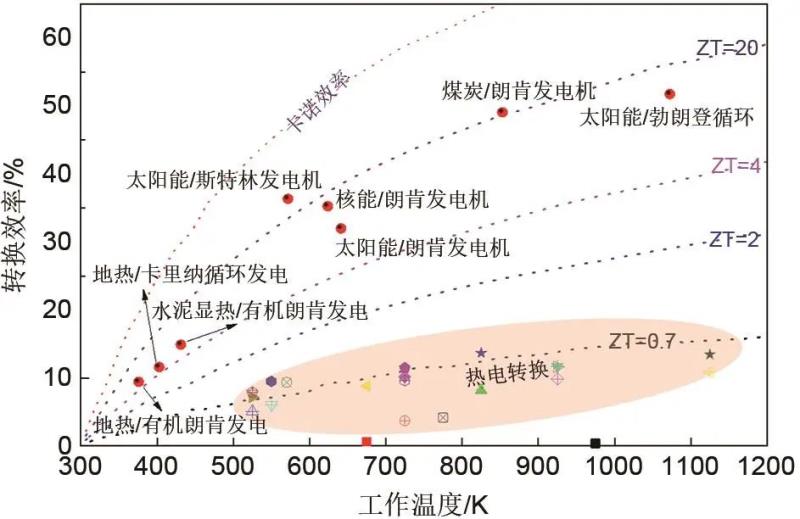 圖2 機(jī)械熱機(jī)的效率與估算最優(yōu)化的熱電轉(zhuǎn)換效率及目前熱電材料的性能比較。