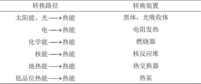 在實(shí)際的能源利用過程中,大量的能源首先轉(zhuǎn)換成熱能,熱能再通過熱機(jī)、熱電、熱反應(yīng)器、黑體輻射等方式轉(zhuǎn)變?yōu)闄C(jī)械能、電能、化學(xué)能和光能再加以利用,如表6所示。