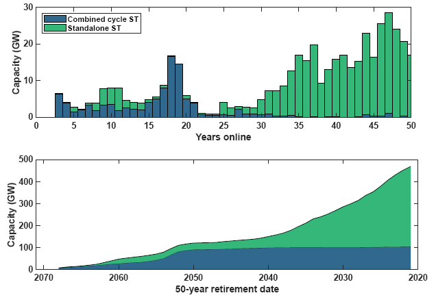 一個(gè)重要的考慮因素是被重新利用的發(fā)電廠的剩余壽命。美國的汽輪機(jī)發(fā)電廠的平均工作壽命是50年。盡管工廠之間存在基于設(shè)備、操作歷史和維修情況的差異,但這是一個(gè)有用的近似值。使用蒸汽輪機(jī)進(jìn)行儲(chǔ)能可以通過降低利用率和更多循環(huán)來延長或縮短標(biāo)稱50年的使用壽命。圖4.9上部的圖表顯示了美國小于50年的汽輪機(jī)裝機(jī)容量的工作壽命。底部的圖表顯示了根據(jù)50年的工作壽命預(yù)計(jì)該容量何時(shí)退役。該圖使用來自美國環(huán)境保護(hù)署2018數(shù)據(jù)庫的數(shù)據(jù),并未考慮新增產(chǎn)能。