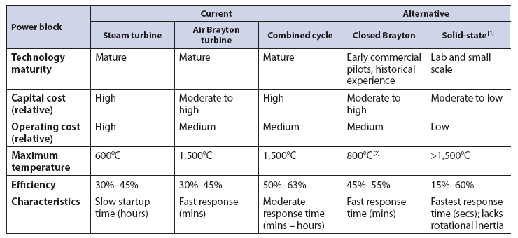 盡管如此,高溫的一個原因是為了實現(xiàn)更高的輻射傳熱率,這對于一些固態(tài)能量轉(zhuǎn)換設備來說是至關重要的。除了效率之外,關鍵指標是成本、靈活性和技術準備情況。靈活性包括啟動時間和成本、斜坡率、最小負載和部分負載效率。出于這項研究的目的,假設未來的熱儲能系統(tǒng)(2050 年時間框架)將足夠靈活,保證在建模分析中排除這些考慮因素。靈活性的價值取決于存儲設備邊界之外的因素。表 4.1 比較了目前占主導地位的熱電轉(zhuǎn)換技術和處于不同發(fā)展階段的替代方案。