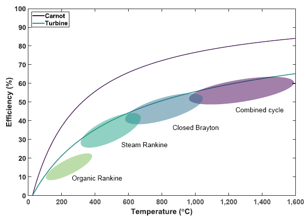 總體而言,蒸汽朗肯循環(huán)使用成熟的技術,可以實現(xiàn)30%~45%的熱電轉(zhuǎn)換效率。