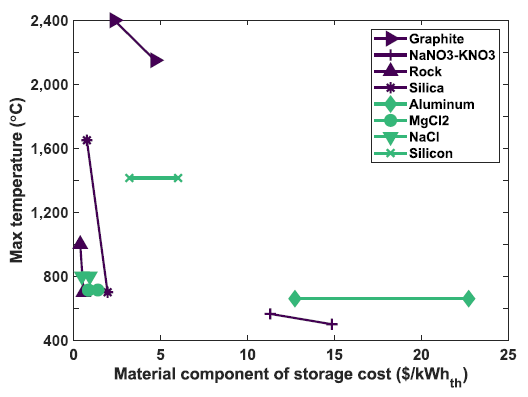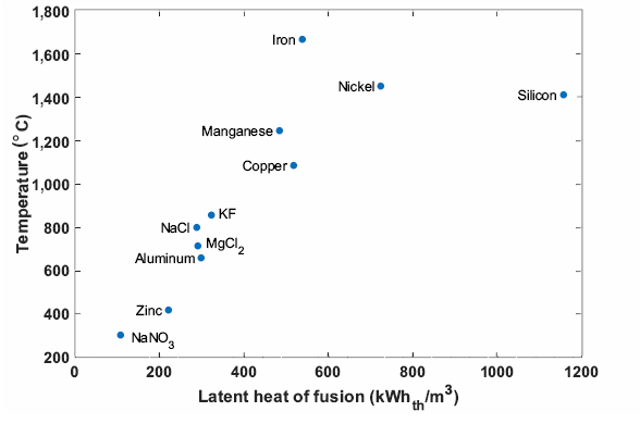 溫度-效率關系通常排除一些溫度不能超過400℃的材料。這些材料可能仍可用于發(fā)電以外的應用。因此,基于材料的能源成本的考慮可以快速過濾掉不相容的選擇。每單位熱能的材料成本可以通過幾個變量來估計。對于顯熱,變量是單位質(zhì)量成本、比熱容和溫度變化。對于儲存潛熱,其變量是單位質(zhì)量成本和熔化潛熱;熔化潛熱是與固體和液體之間的相變相關的能量。