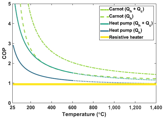 電阻加熱器可以將電能轉(zhuǎn)化為熱能,COP超過90%,但其COP不能超過100%。電阻加熱器可以直接放置在儲能材料中,內(nèi)置在管道中,或放置在容器或管道附近進行間接加熱。感應加熱使用振蕩磁場在儲能材料或中間傳熱流體內(nèi)產(chǎn)生熱量。感應加熱相比間接電阻加熱可以克服一些傳熱阻力;然而,感應加熱設備更昂貴,并且不適用于所有材料。