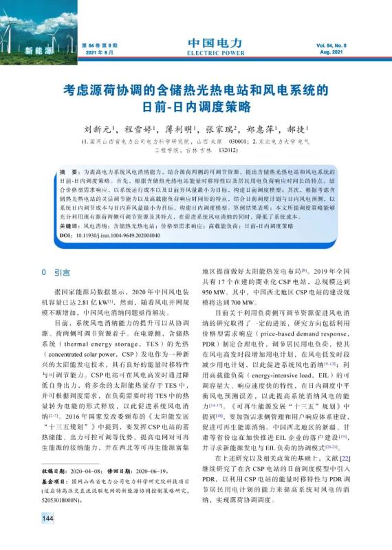 劉新元, 程雪婷, 薄利明, 等. 考慮源荷協(xié)調(diào)的含儲(chǔ)熱光熱電站和風(fēng)電系統(tǒng)的日前-日內(nèi)調(diào)度策略[J]. 中國(guó)電力, 2021, 54(8): 144-153.