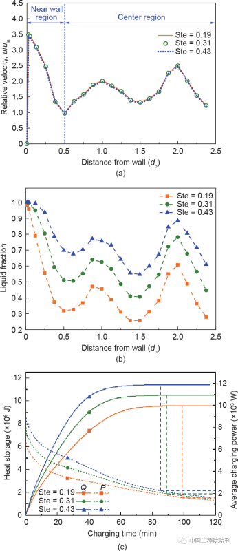 與上一部分類似,基于直徑比為5的堆積床相變儲熱系統(tǒng),保持雷諾數Re=4998.72,當換熱流體的進口溫度分別取445 ℃、465 ℃和485 ℃時,堆積床內史蒂芬數Ste分別為0.19、0.31和0.43。圖15(a)為不同史蒂芬數下堆積床內相對流速的分布,發(fā)現(xiàn)三者的分布重合,這意味著史蒂芬數的改變對堆積床內流速的大小及分布均無影響,因此堆積床進出口壓降的變化微弱。換熱流體與相變膠囊之間的對流換熱作用基本不變,但由于史蒂芬的增大代表著進口溫度的增大,這將增大換熱流體對相變膠囊的換熱溫差,從而增強相變膠囊的對流換熱。如圖15(b)所示,相變材料的儲熱過程均隨著史蒂芬數的增大而增大。