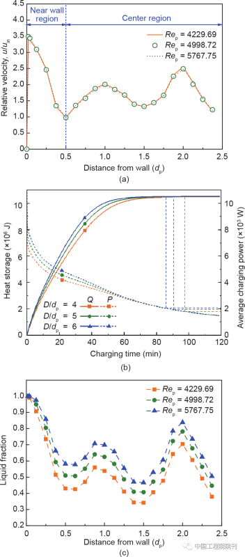 圖15 不同雷諾數堆積床LHS系統(tǒng)的流動與熱性能。(a)徑向相對流速分布;(b)1200 s時徑向液相分數分布;(c)儲熱量與平均儲熱功率