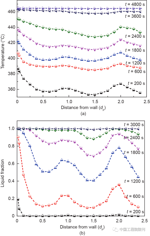 圖9 相變材料不同時刻的徑向分布。(a)溫度;(b)液相分數