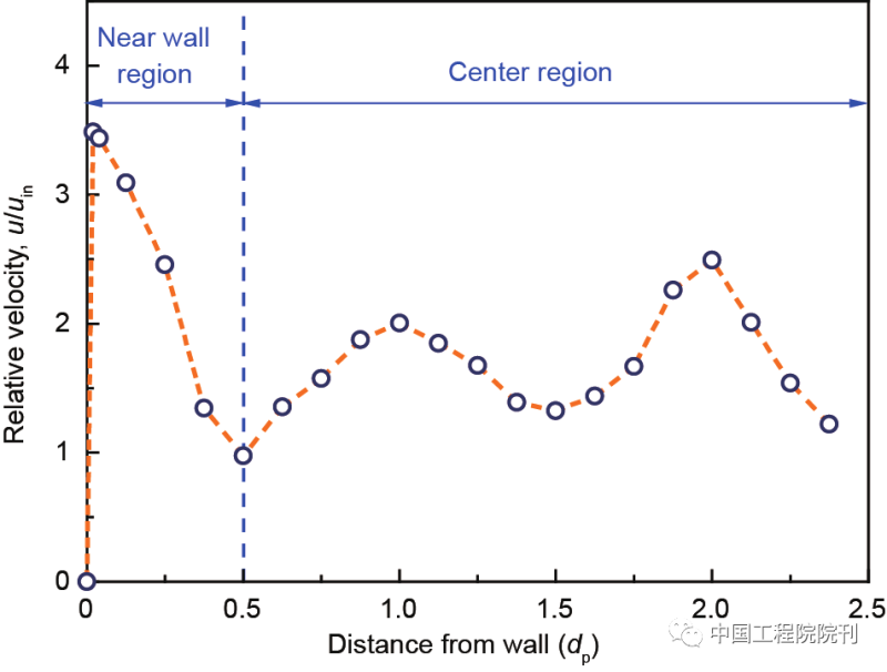 圖7展示了堆積床內換熱流體相對速度沿徑向方向的分布,可以發(fā)現(xiàn)相對速度也呈現(xiàn)出振蕩的分布。盡管堆積床在壁面處的孔隙率接近1,但由于換熱流體與壁面之間存在黏性作用,壁面處的流速為0。沿著遠離壁面的方向,換熱流體的流速急劇增大并呈現(xiàn)出與徑向孔隙率一致的分布。換熱流體進入堆積床后從相變膠囊之間的空隙流過,空隙越大的徑向位置對換熱流體的阻力就越小。所以孔隙率大的位置有更多的換熱流體流過,相應的流速也更大。為了便于對相對流速分布進行分析與比較,我們將堆積床沿徑向方向分為兩個區(qū)域:近壁面區(qū)域和中心區(qū)域。其中近壁面區(qū)域為從壁面到遠離壁面0.5dp的區(qū)域,流速在這里發(fā)生了劇烈的變化;而中心區(qū)域則是從遠離壁面0.5dp到罐體中心的區(qū)域,流速在這里的變化則更為平緩。