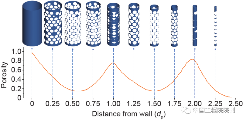 (1)通過沿堆積床徑向截取了一系列的圓柱截面,直觀地解釋了徑向孔隙率振蕩分布的原因。當徑向圓柱截面處的相變膠囊為點接觸時,形成的空隙會造成高孔隙率,而當圓柱截面貫穿相變膠囊時,相變材料占據圓柱面上大部分區(qū)域,從而導致低孔隙率。