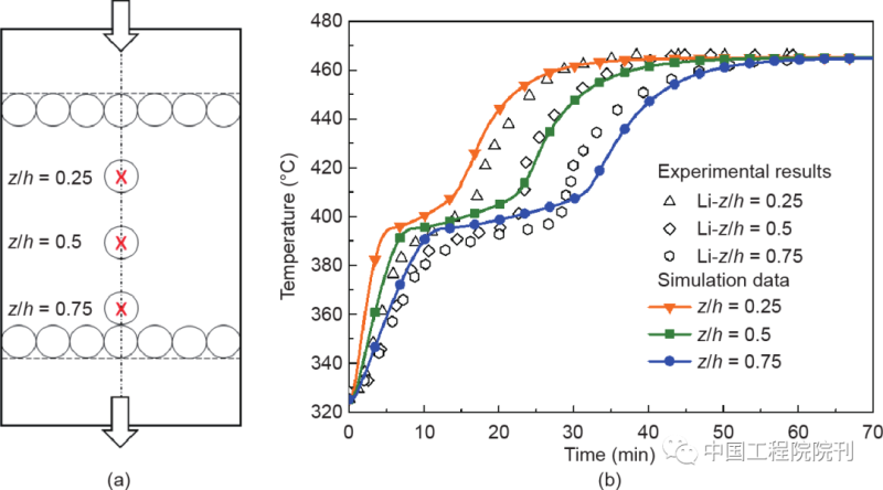 如圖5(b)所示,三個位置處的模擬數據與實驗數據均吻合較好,其中z/H = 0.5處的結果最佳。儲熱過程剛開始時,模擬數據快于實驗數據;但是相變材料完成相變過程后,模擬數據與實驗數據基本同步,并且模擬與實驗幾乎同時完成儲熱過程。一方面,將換熱流體從初始溫度(如325 ℃)加熱到入口溫度(如465 ℃)的加熱過程較長,而在模擬中這一過程是在很短時間內完成的。另一方面,當儲熱過程進行到液態(tài)儲熱階段時,相變材料已經完成了相變儲熱過程,初始狀態(tài)下入口溫度變化的不同而造成的儲熱量的差異相對于系統(tǒng)整體的儲熱量而言已經很小,所以模擬數據與實驗數據越往后吻合度越高。總體而言,模擬與實驗結果的對比驗證了三維堆積床相變儲熱模型的可靠性與有效性。