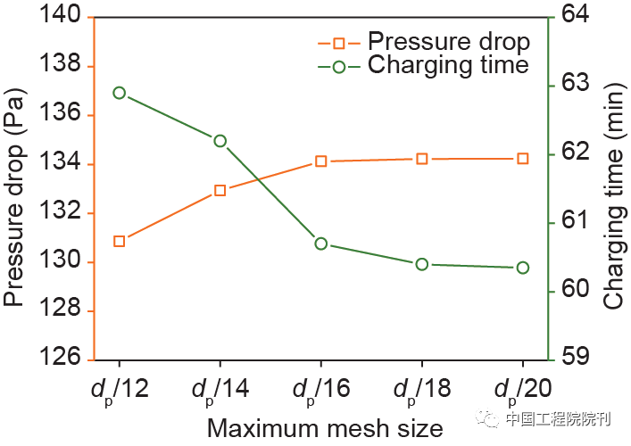 由于有數百個相變膠囊隨機填充在堆積床中,因此采用非結構化網格對該三維結構進行網格劃分。首先利用shrink-wrap方法對堆積床球體表面進行包面處理,然后使用多面體網格進行網格的填充。隨后,確定網格尺寸對填充時間和堆積床中壓降的影響,并選擇dp/18 網格尺寸進行網格生成,如圖4所示。在計算過程中,利用SIMPLE算法實現(xiàn)壓力場與速度場的耦合迭代,離散方程采用二階迎風格式,瞬態(tài)方程的求解則是使用了二階隱式格式。